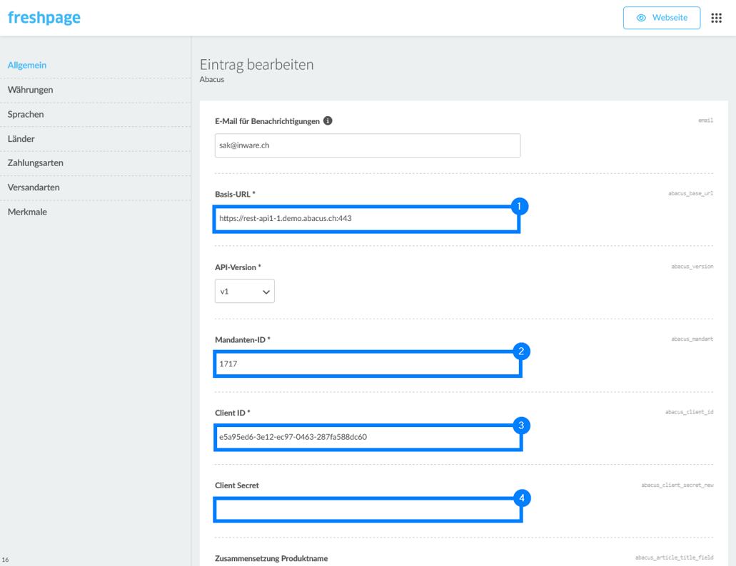 Um den Webshop mit Abacus zu verbinden, müssen in der Konfiguration > Allgemein > Abacus die Zugangsdaten hinterlegt werden. Die Zugangsdaten bestehen aus der Basis-URL (1), der Mandanten-ID (2), der Client-ID (3) und dem Client Secret (4). Nach Eingabe der Daten, die Konfiguration speichern.