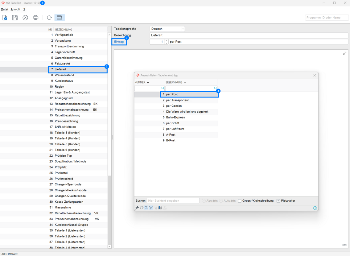 Die entsprechende Abacus-ID finden Sie im Programm O461 > Tabelle 7 > Eintrag > Lieferart.