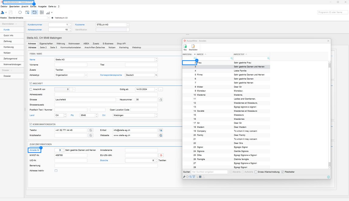 Sie finden die ID der Anrede im Abacus wie folgt: Programm D31 > Zusatzinformationen > Anrede-Nr > Auswahlliste > Anredenummer. Der letzte Schritt ist die Verknüpfung der Adressen zwischen Webshop und Abacus. Gehen Sie dazu im Webshop auf Konfiguration > Allgemein > Anrede und wählen Sie «Anrede» aus. Im Feld «Abacus-ID» können Sie nun die entsprechende ID von Abacus eintragen.