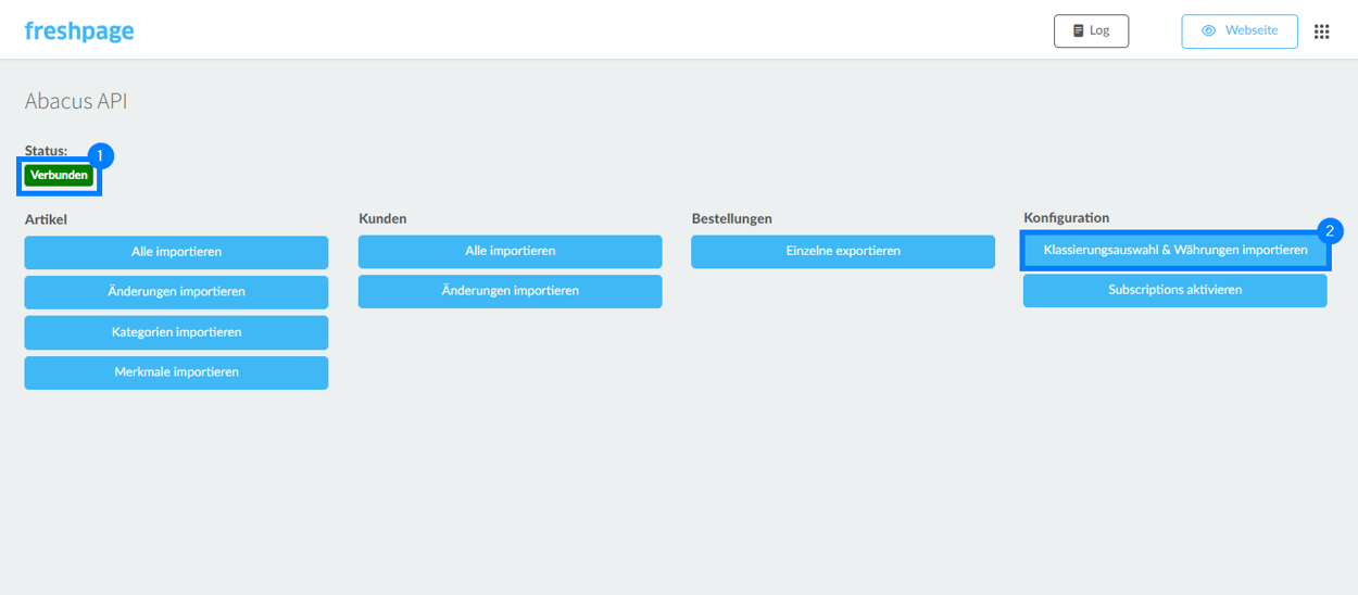 Wechseln Sie in das Modul «Abacus API» und überprüfen Sie unter «Status», ob der Webshop mit Abacus verbunden ist. Danach klicken Sie auf den Button «Klassierungsauswahl & Währungen importieren», um die allgemeinen Einstellungen von Abacus in den Webshop zu übernehmen.